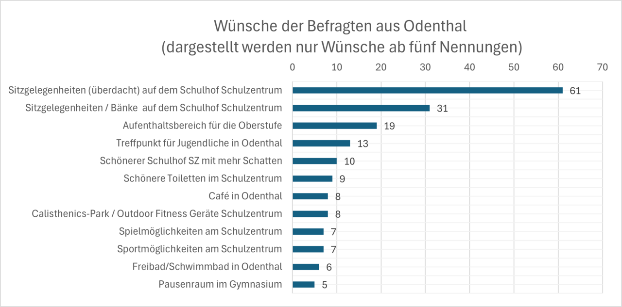 Die Befragung in Odenthal ergab den Wunsch, dass mehr überdachte Sitzmöglichkeiten im Bereich des Schulzentrums aufgestellt werden sollen. Hier geht es zu den Ergebnissen.